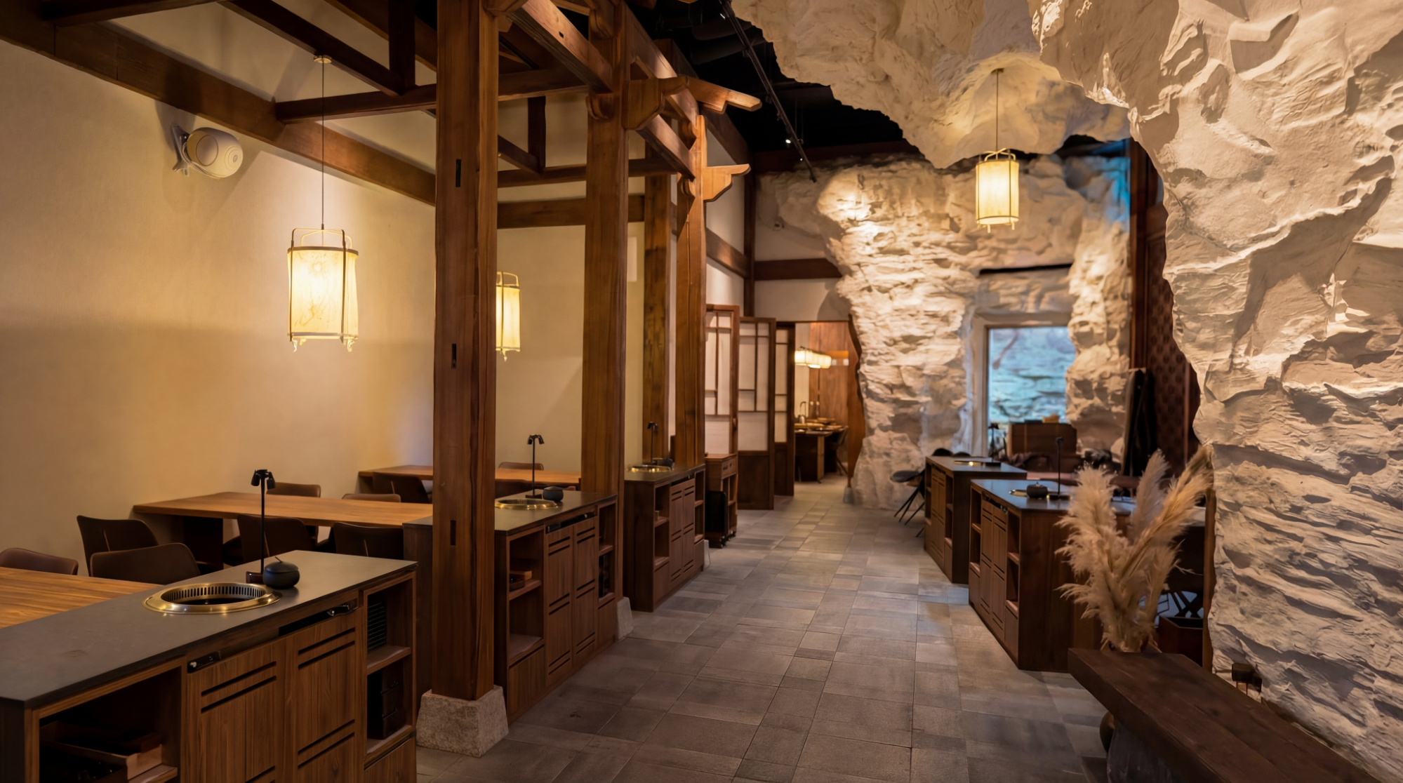 You’ll be impressed by the roomy restaurant, where sculpted stone walls and layered textures create a cool, cave-like feel. Traditional Korean touches are woven throughout the design, making the interior feel both unique and welcoming.