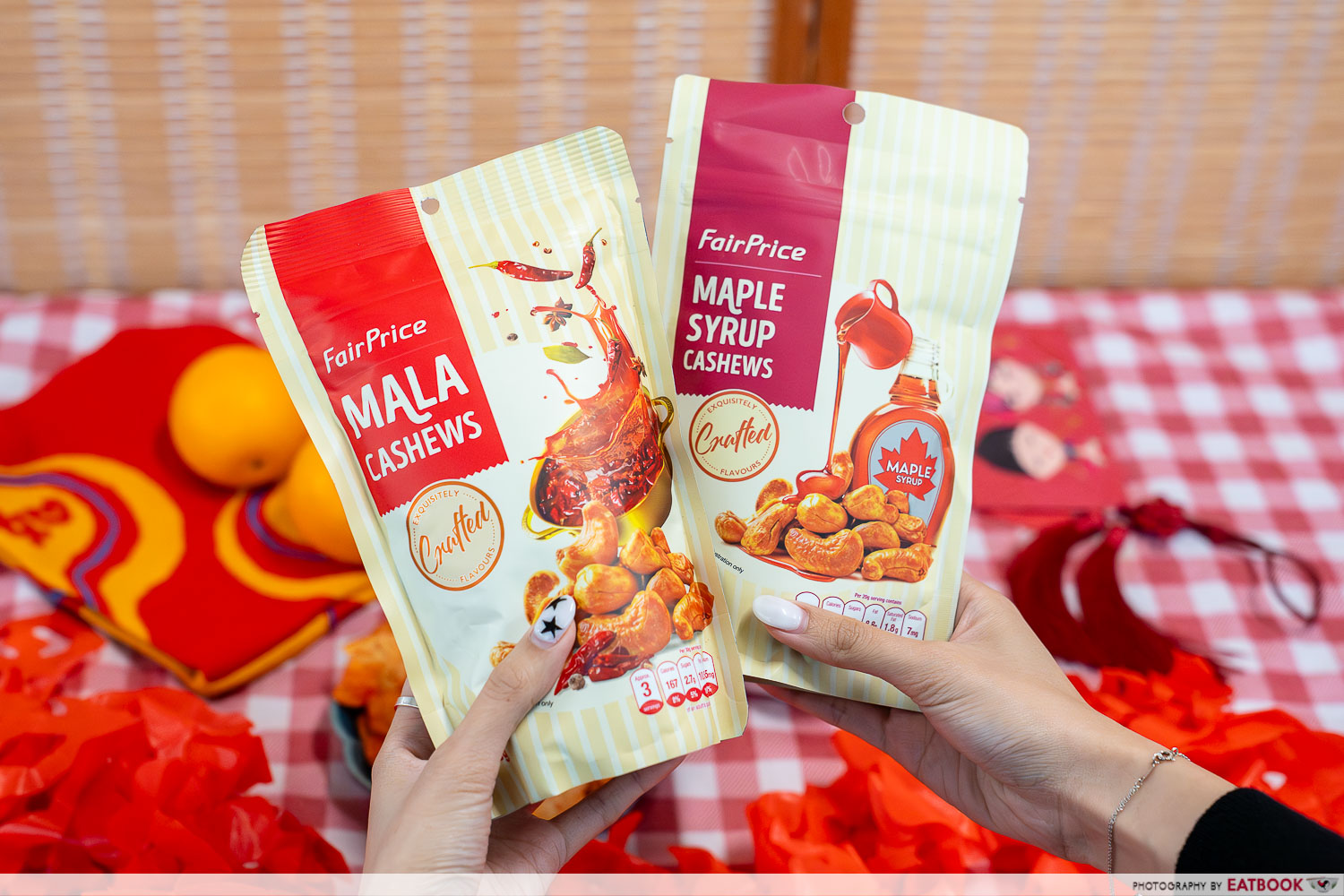 FairPrice’s best-selling flavoured cashews have also received a CNY upgrade, starring two brand-new options: Mala Cashews and Maple Syrup Cashews.